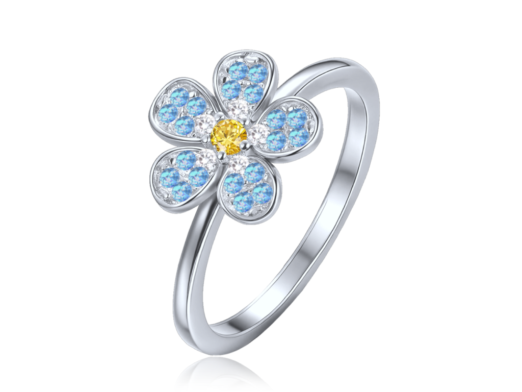 MINET Dětský stříbrný prsten kytička s modrým, bílým a žlutým zirkonem vel. 53