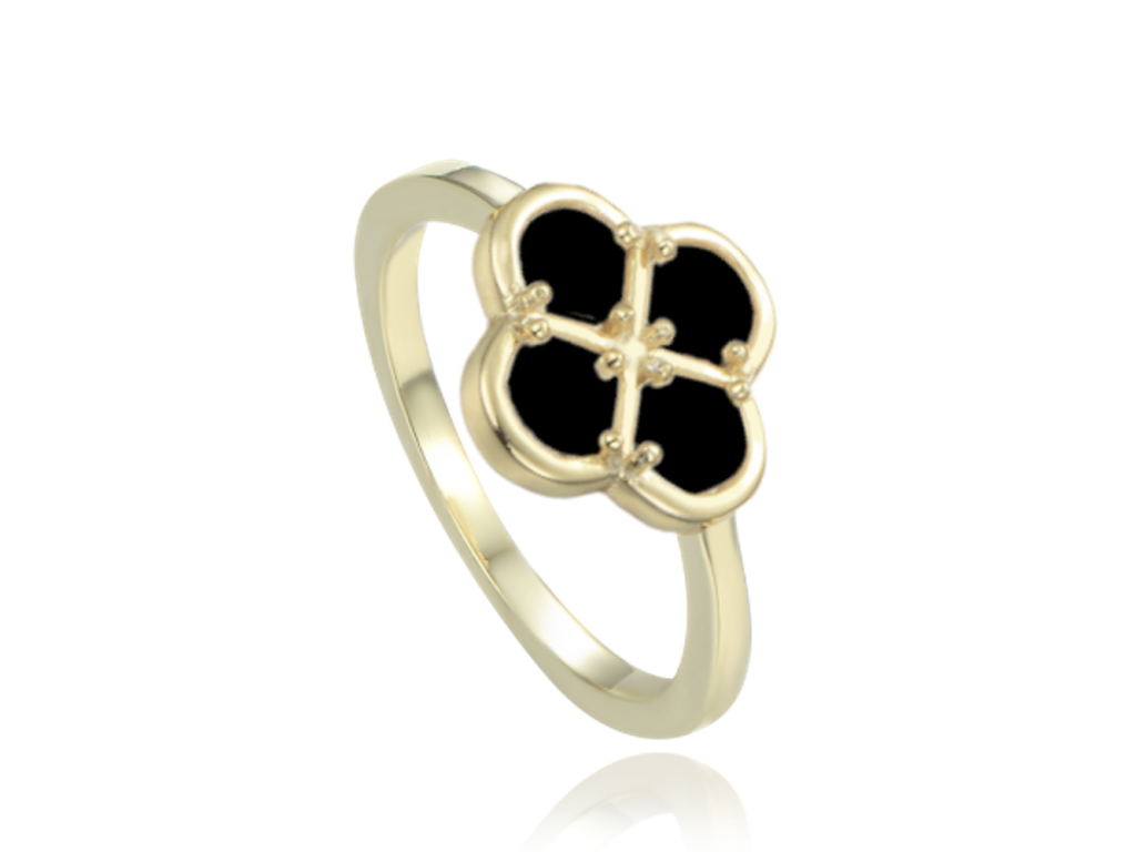 MINET Pozlacený stříbrný prsten čtyřlístek s černou perletí vel. 58