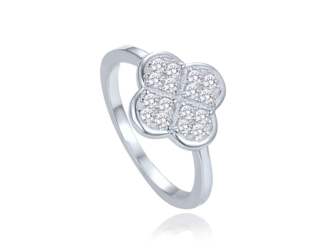 MINET Stříbrný prsten čtyřlístek s bílými zirkony vel. 58