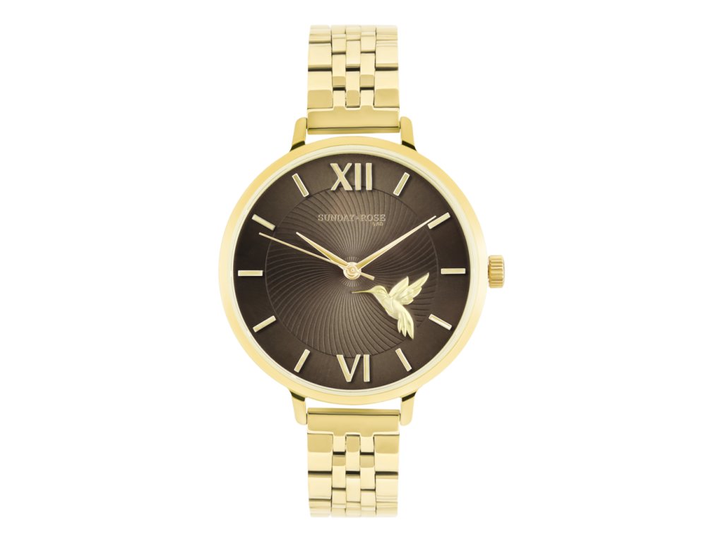 Teplý zlatý odstín, jemný lesk a hnědý ciferník s plastickým kolibříkem – to jsou hodinky Sunday Rose SUN-F21, které působí jako paprsek slunce v každodenním shonu. Každý detail je promyšlený tak, aby vyzařoval ženskost a klid. Spirálový reliéf ciferníku se krásně leskne při dopadu světla a zlaté ručky i indexy mu dodávají harmonii a hloubku.