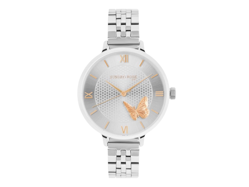 Lehkost motýlích křídel, lesk kovu a jemná hra světla – dámské hodinky Sunday Rose SUN-F22 jsou ztělesněním elegance a něhy. Na stříbrném ciferníku se vyjímá plastický motýl v barvě růžového zlata, který působí jako symbol svobody, proměny a ženské krásy. Jemná včelí struktura ve středu číselníku vytváří nádherný efekt při dopadu světla a dodává hodinkám jedinečný charakter.