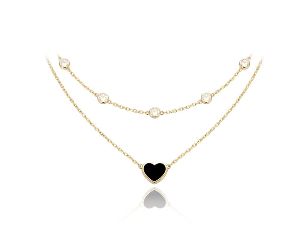 MINET Dvojitý zlatý náhrdelník srdíčko s onyxem a bílými zirkony Au 585/1000 3,50g