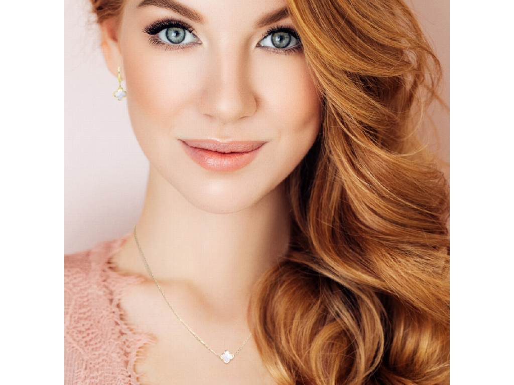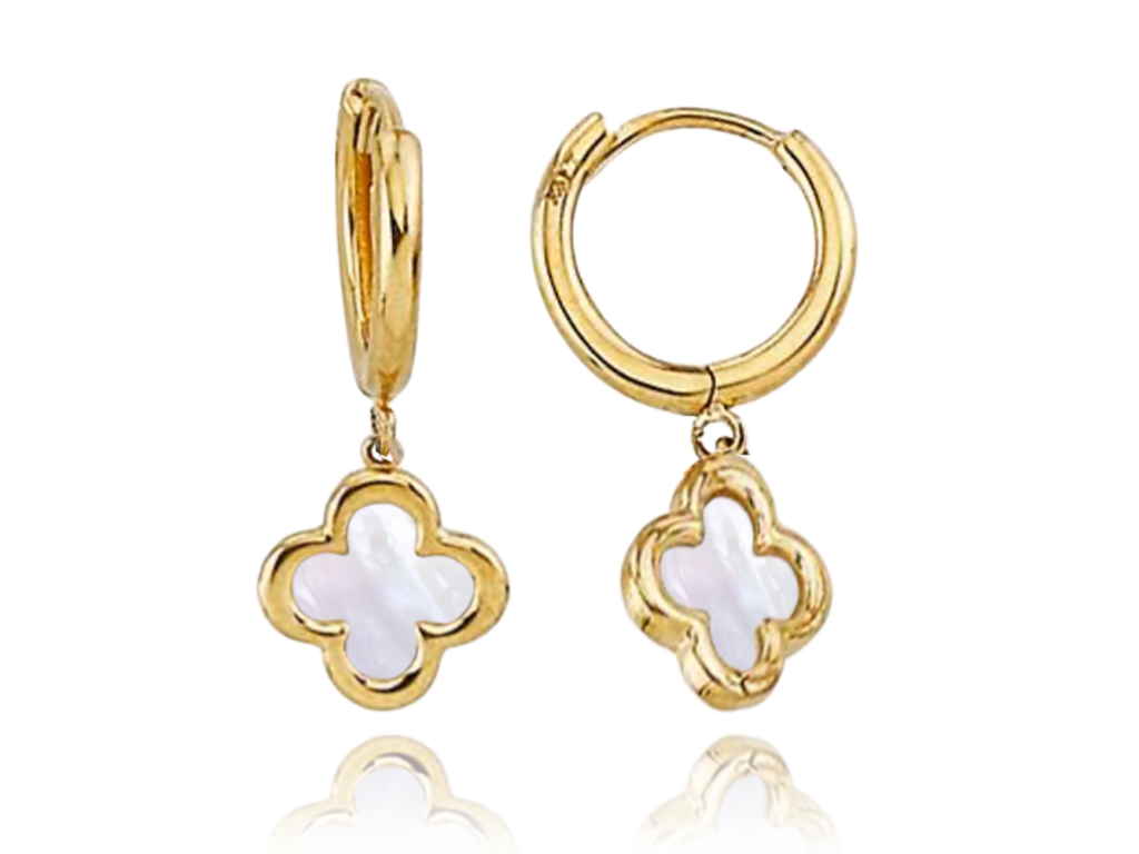 MINET Zlaté náušnice kroužky čtyřlístky s bílou perletí Au 585/1000 2,30g